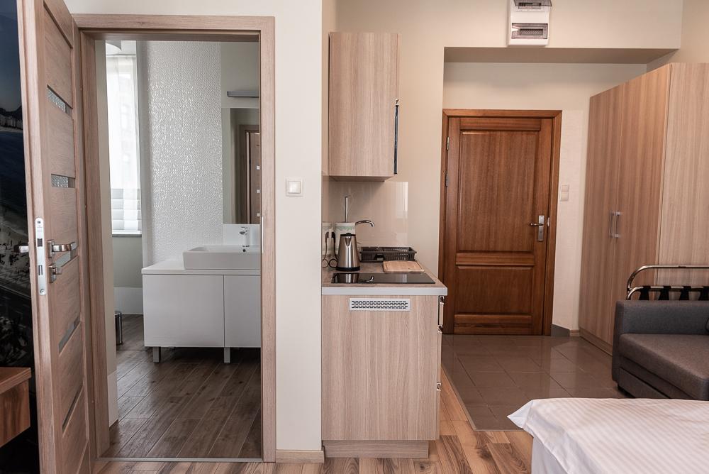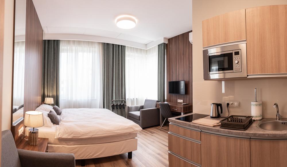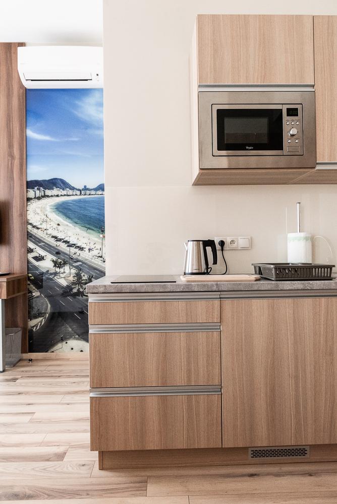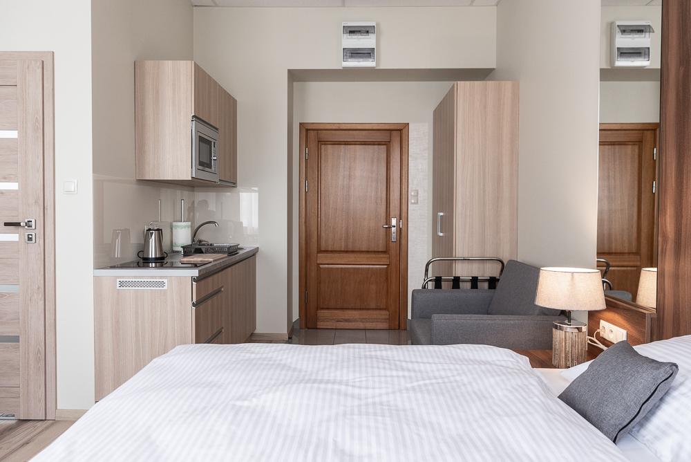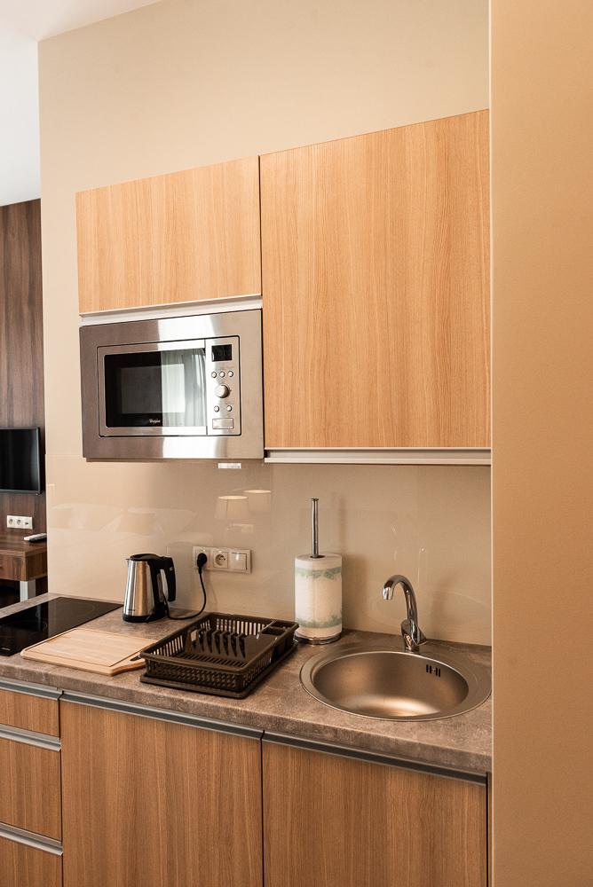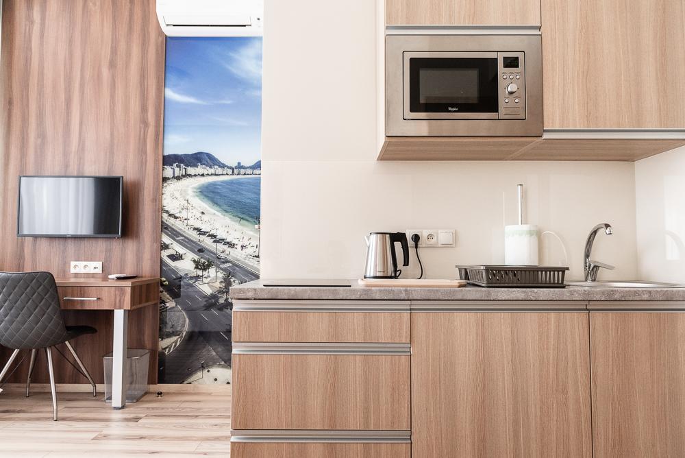 Powierzchnia pokoju/studia 28 m². Apartament maksymalnie dla 2 dorosłych osób + 2 dzieci (2 x dostawka). To klimatyzowane studio dysponuje w pełni wyposażonym aneksem kuchennym, zestawem do parzenia kawy i herbaty, czajnikiem elektrycznym, oraz telewizorem z płaskim ekranem z dostępem do kanałów satelitarnych, wi-fi, oraz bardzo wygodnym łóżkiem z podwójnym materacem i prywatną łazienką.