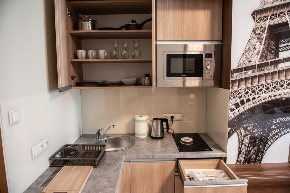 Powierzchnia pokoju/studia 21 m². Apartament maksymalnie dla 2 osób. To klimatyzowane studio dysponuje w pełni wyposażonym aneksem kuchennym, zestawem do parzenia kawy i herbaty, czajnikiem elektrycznym, oraz telewizorem z płaskim ekranem z dostępem do kanałów satelitarnych, wi-fi, oraz bardzo wygodnym łóżkiem z podwójnym materacem i prywatną łazienką.