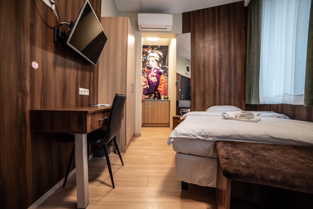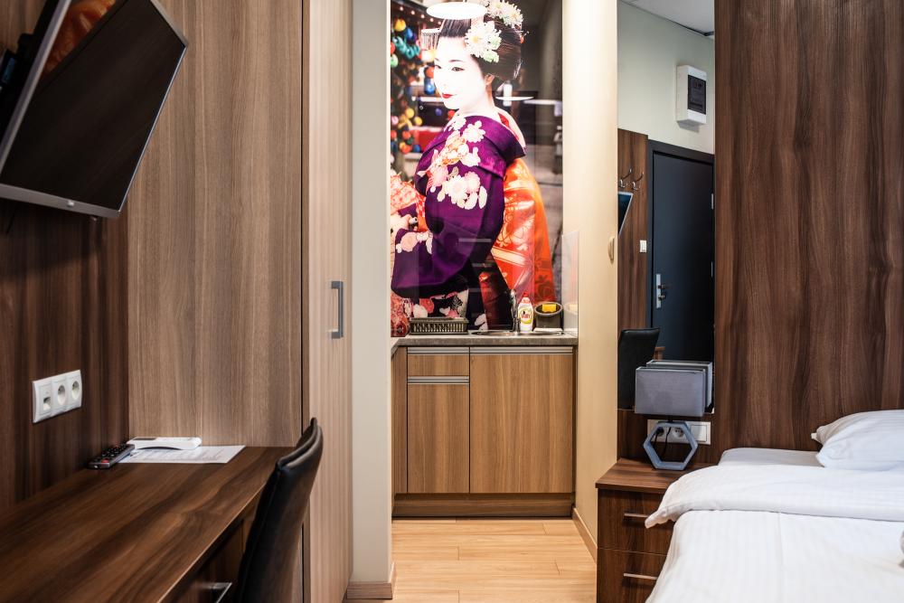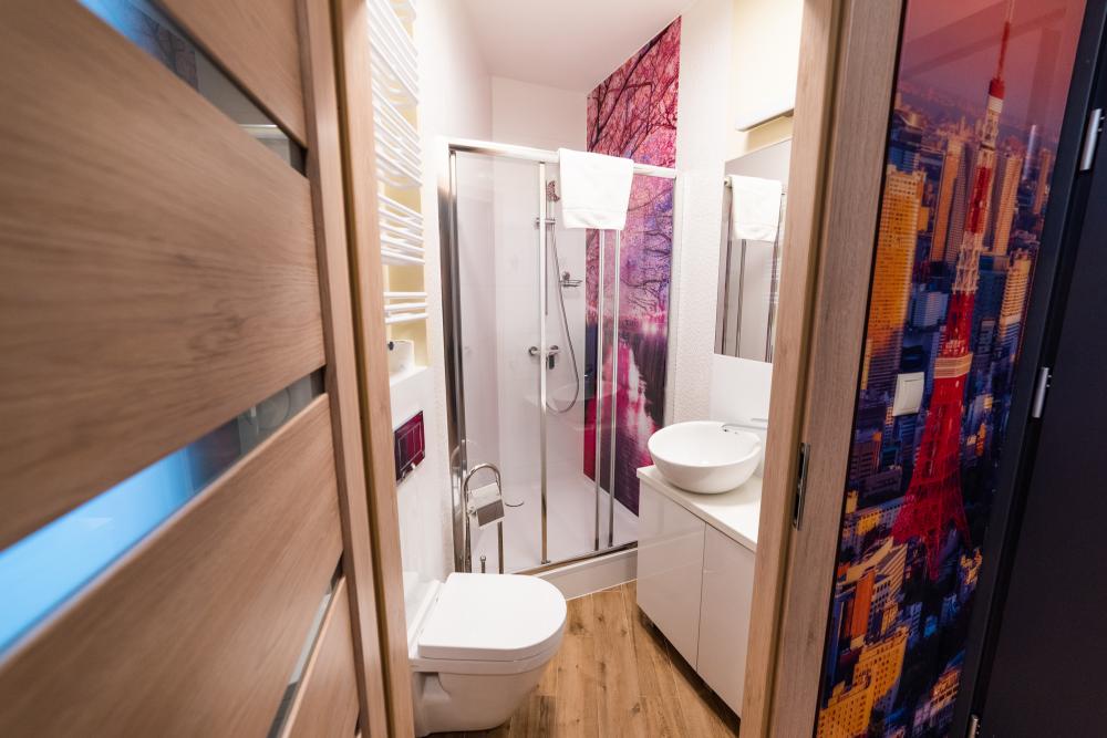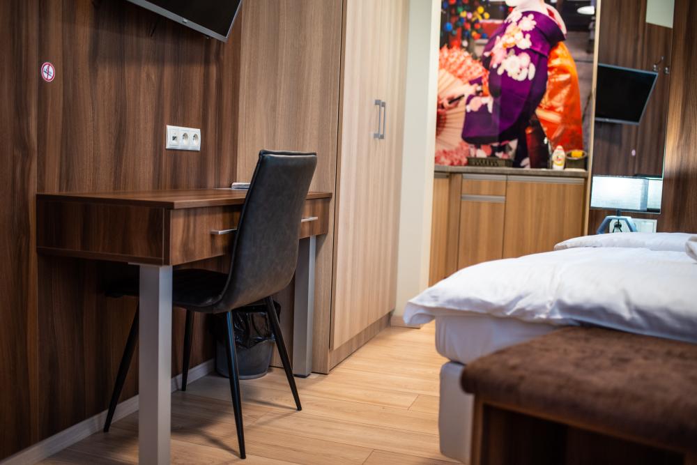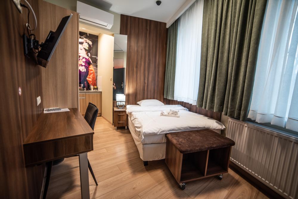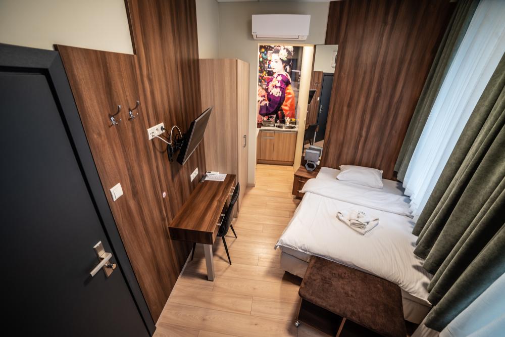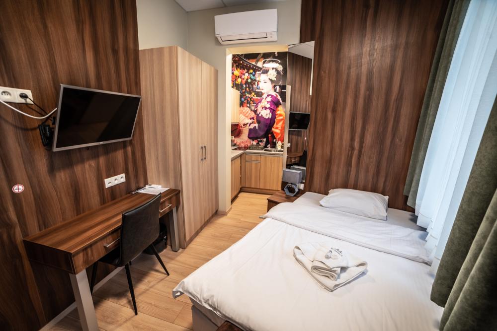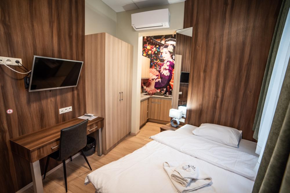 Powierzchnia pokoju/studia 15 m². Apartament maksymalnie dla 2 osób. To klimatyzowane studio dysponuje w pełni wyposażonym aneksem kuchennym, zestawem do parzenia kawy i herbaty, czajnikiem elektrycznym, oraz telewizorem z płaskim ekranem z dostępem do kanałów satelitarnych, wi-fi, oraz bardzo wygodnym łóżkiem z podwójnym materacem i prywatną łazienką.